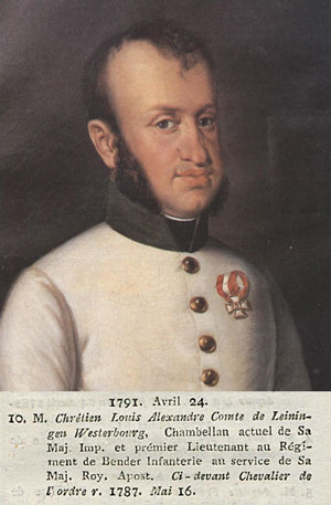 Count Ferdinand Karl III was the third hereditary ruler of the Grafschaft of Leiningen – Westerburg – Neuleiningen to serve as Grand Master of the Order of Saint Joachim. Count Ferdinand Karl III, ruler of Leiningen – Westerburg – Neuleiningen, was the Grand Master of the Order when the Cross of the Grand Commander of The Order of Saint Joachim was awarded to Admiral Lord Nelson for his victory over the French forces of Napoleon at the Battle of the Nile. Count Ferdinand Karl III was born in 1767 and died in 1813. He succeeded his father as ruler of Leiningen – Westerburg – Neuleiningen in 1798 and ruled until his own death in 1813.