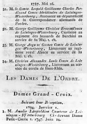 Numerous member of the Leiningen were members of the Order of Saint Joachim, as shown in contemporary Order records, including Amalie Leopoldine, Countess zu Leiningen, who became a member in 1787 and became a Dame Grand Cross in 1794.